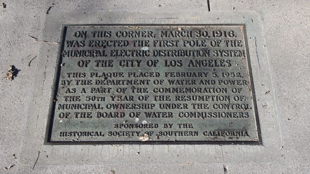 This plaque commemorating the first utility pole in Los Angeles was placed in 1952 to celebrate the 50-year anniversary of when Los Angeles took control of of its water system and formed the Water Department under the control of the Board of Water Commisioners. The Water Department is now the DWP, but it’s still governed by the five-member Board of Water and Power Commisssioners.