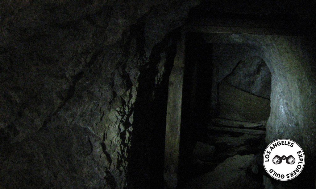 Shortly inside the lower entrance, the mine splits into two passages, one to the north and one to the west. The passage to the north opens into a 55-foot deep pit. This is an old winze (mining speak for an internal shaft) that was blasted out sometime around 1935 to allow better access to the gold vein. This pit is often filled with water, making it dangerously hard to see, especially when the rest of the mine floor is covered with water. Beyond this pit a small waterfall trickles into the tunnel.