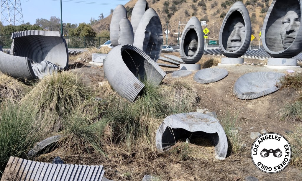 This eye-catching piece of public art, consisting of nine stone sculptures ranging from eight to 12 feet in height, decorates the first real roundabout installed in Los Angeles. The colloquially named Riverside Roundabout sits at the intersection of San Fernando Road and Figueroa Street, at the base of the Riverside-Figueroa Bridge, where it marks a confluence of roads, rails, and rivers.