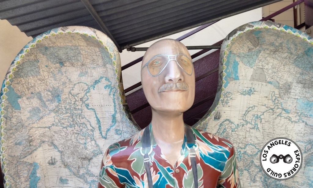 if you’ve ever spent time wandering about the stalls and restaurants of the Original Farmers Market at 3rd & Fairfax, you may have happened upon an unusual sight — a bespectacled old man with an old man mustache (bearing more than a passing resemblance to the late Stan Lee) dressed in an Aloha shirt, Bermuda shorts (or maybe cut-off jean shorts), and wearing what appears to be a pair of penny loafers. He’s got a camera around his neck and a massive pair of map- and postcard-encrusted wings sprout from his back.