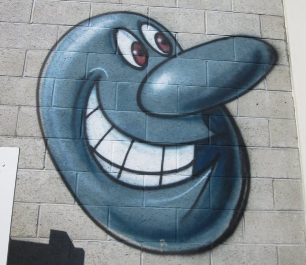 Today this mural looks different than it did even earlier in the year. The wall is in a high-graffiti area and, as such, is often vandalized. The design seen here feels a bit different than Scharf’s usual far-out characters, but the figures shown in the upper left inset (which are painted on the wall to the left of the garage entrance) are classic Scharf cartoon faces.