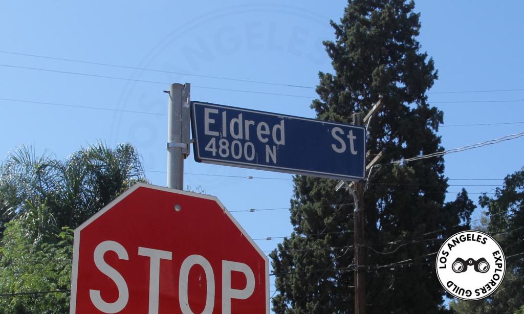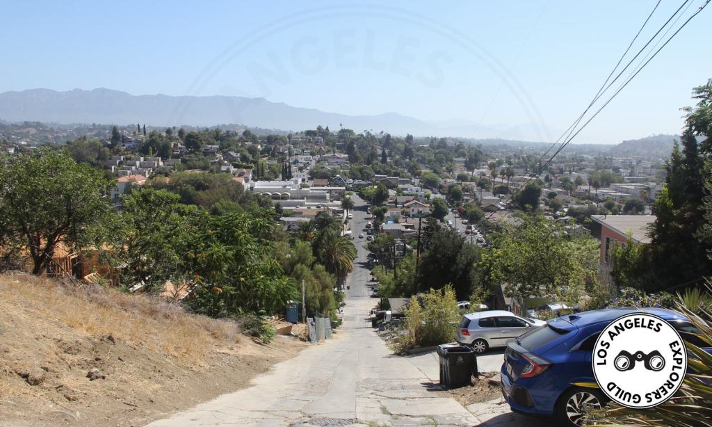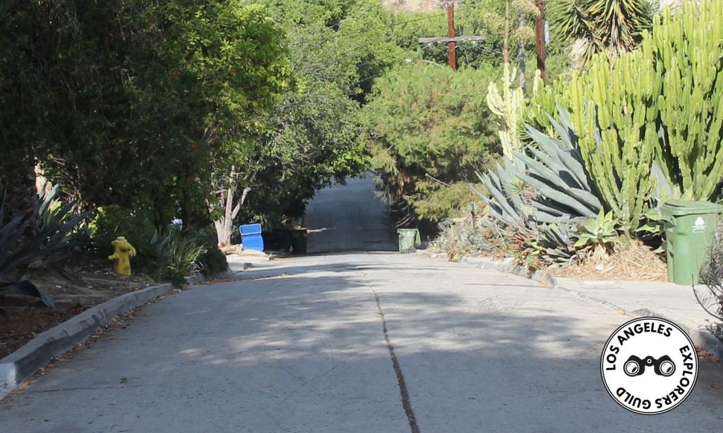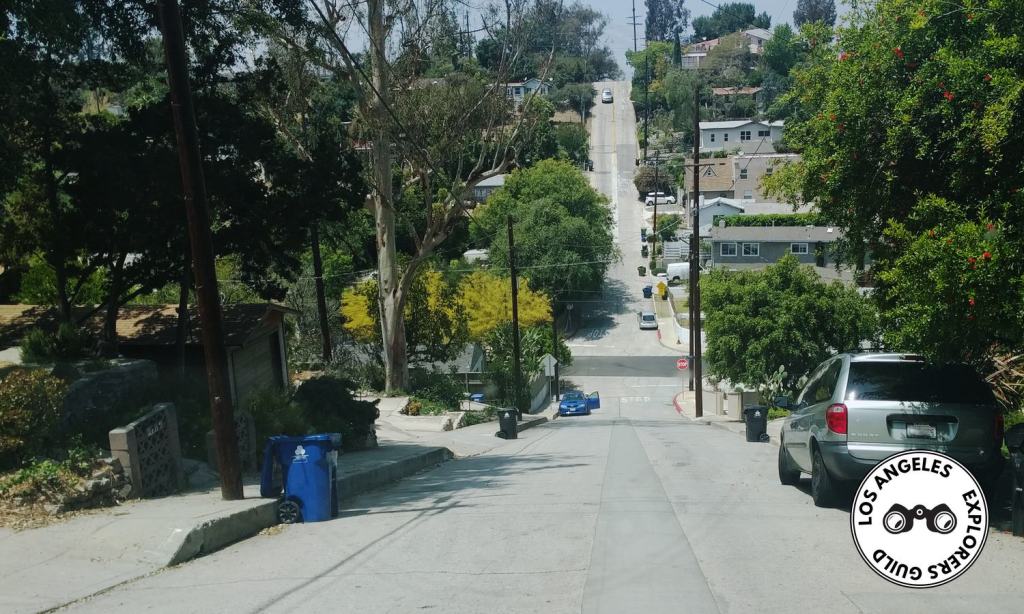Eldred Street dates back to 1912. It’s so steep that the postal service stopped driving up it years ago to deliver mail to the residents (who call themselves Eldred Highlanders). Instead, all mail is delivered to a special post office box at the bottom (at the intersection with Avenue 48). The DWP also has trouble traversing Eldred’s grade — it uses special mini garbage trucks to complete the Tuesday trash runs.