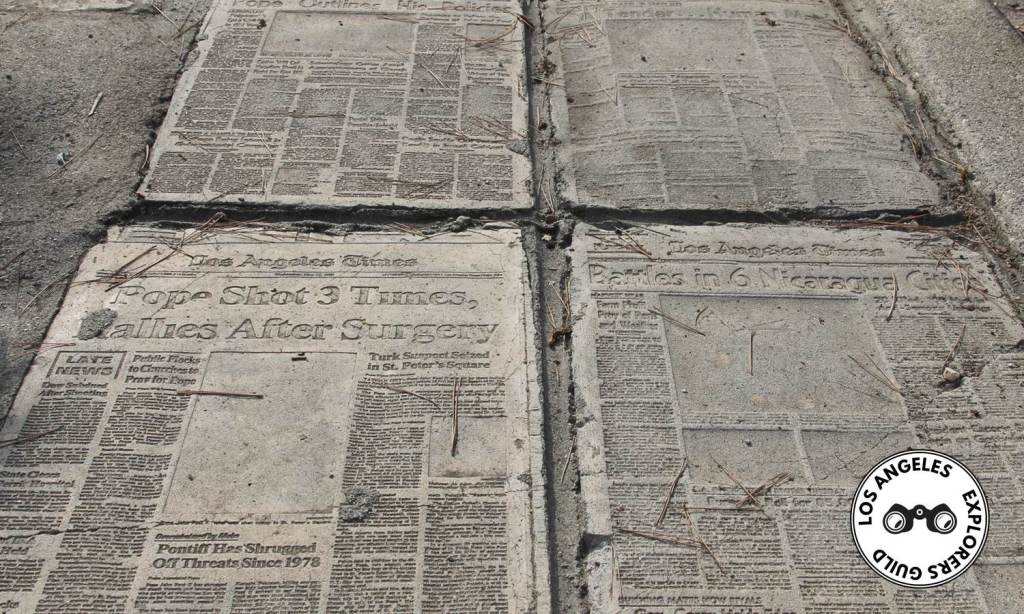 At the top of a quiet street in Highland Park, pedestrians can view a series of Los Angeles Times front page headlines preserved in concrete.