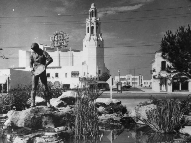 When the statue was dedicated in 1927 it was part of an elaborate fountain bearing the awkward name “Pioneer Fountain Group” that stood over a pond in front of the Carthay Circle Theatre (so named because the floor formed a circle), one of the most famous movie houses of Hollywood’s Golden Age. Likely due the unwieldy name, the sculpture was also known as the Daniel O. McCarthy Pioneer Fountain and the Miner’s Statue.