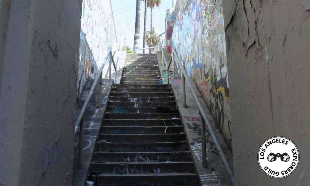 The first step in traversing the 110 Walkway is climbing up a set of steps that form part of a concrete support for the overpass above. The stairs are sort of hidden, but you can find them at these coordinates: 34.080900, -118.225328.