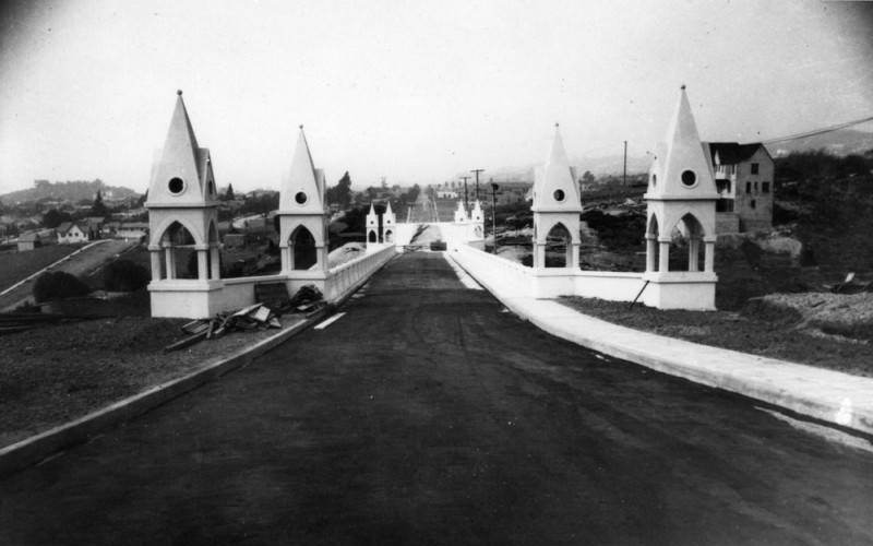 The Sacatela Creek used to run in the ravine under the bridge, but its course was diverted to nearby storm drains back in 1917. Eventually, part of the area was paved over with the end of Monon Street. Today there’s a small park, the Shakespeare Bridge Garden, underneath the bridge and a round building housing the Los Feliz campus of the Lycée International sits just to south.