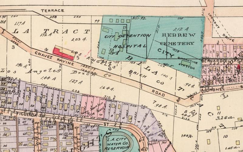In 1854, the Hebrew Benevolent Society of Los Angeles, the first charitable organization in L.A., was formed for the express purpose of obtaining a tract of land suitable for a Jewish cemetery. In 1855, they did just that when they acquired three acres at the junction of Lilac Terrace and Lookout Drive in Chavez Ravine, part of the Abila Tract.