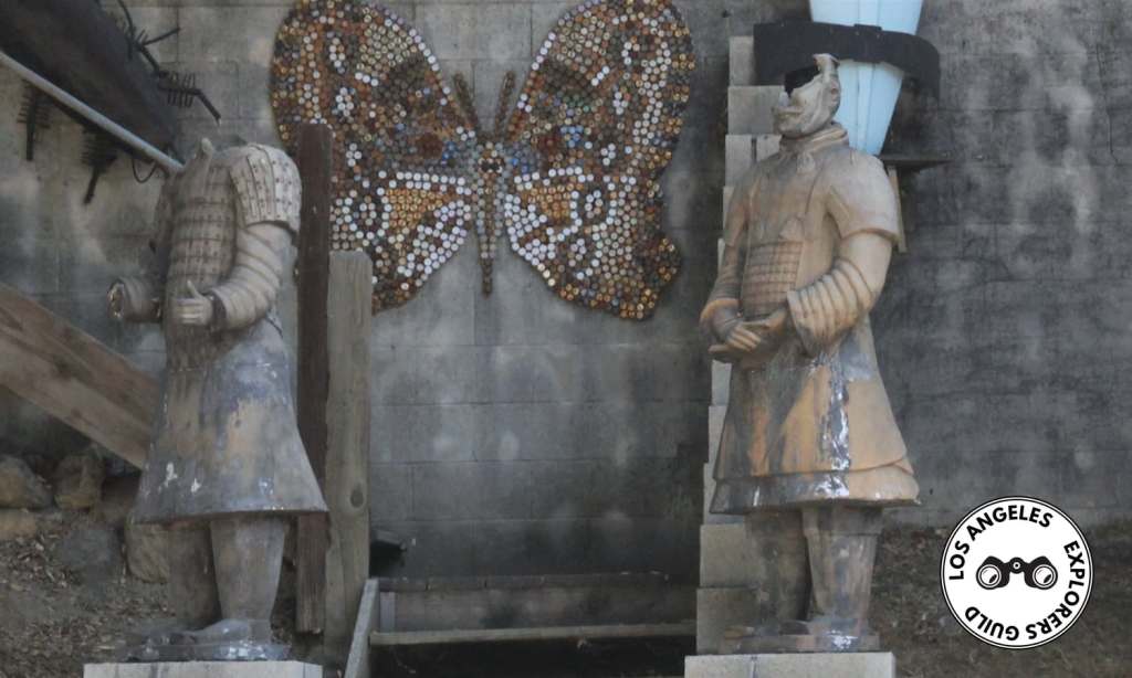 Terracotta Warriors. Two replica Terracotta Warriors were donated to the wall in 2012. These stout figures required some support, so Denman built cinder block pedestals for them to stand on. They now guard passage to a stairway that leads to his property. Unfortunately someone damaged the two Terracotta statues — breaking off their heads and hands in early 2021.