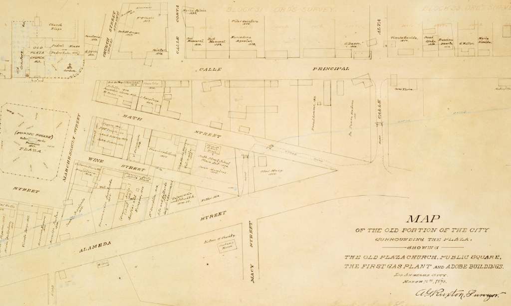 The Zanja Madre ran for more than a mile from the Los Angeles river into the central plaza of the Los Angeles Pueblo. Thanks to a series of red bricks placed in a herringbone pattern, you can still see where the ditch crossed Olvera Street (back when it was known as Wine Street), near the Avila Adobe, as seen on the 1873 map of the pueblo by cartographer A.G. Ruxton.