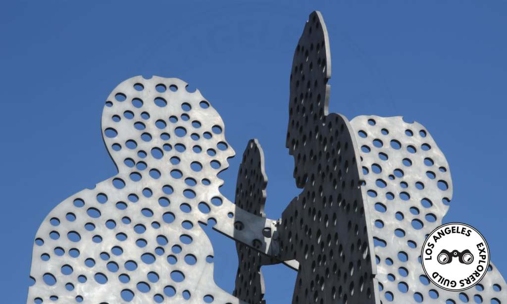 In Little Tokyo, you can see a tall aluminum sculpture of four figures filled with holes in front of a government building.