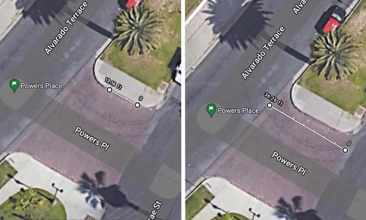Powers Place is as wide as a narrow city street, which is about 35 feet. As you can see in the image above, it’s a reasonably square patch or road, so it’s also about 35 feet long. This is easy to determine by walking the length and width of the street or by navigating to Powers Place on an online map and employing the built-in measuring tool.