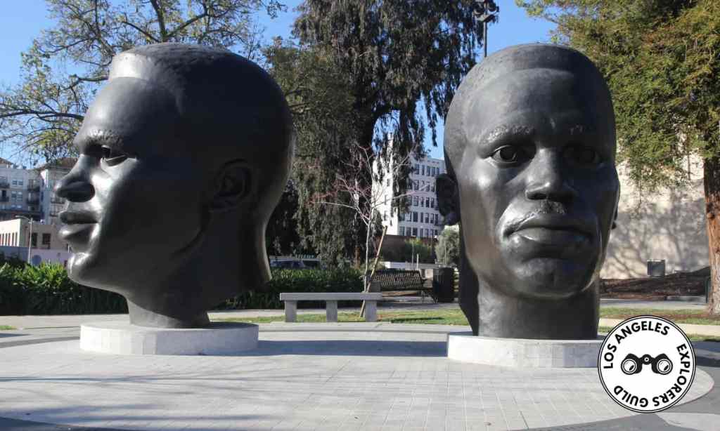 Just outside Pasadena City Hall, you’ll find two giant heads — one of baseball player Jackie Robinson and the other of Olympic athlete Mack Robinson.