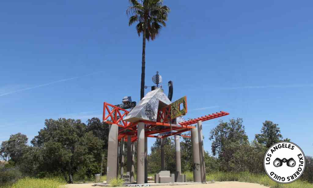 The eye-catching sculpture placed at Angels Point was designed by Echo Park-based artist Peter Shire in 1994. The sculpture, commissioned by the Department of Cultural Affairs, is meant to serve as an echo to the skyline of Downtown Los Angeles — the view of which is excellent from Angels Point, especially during sunrise.