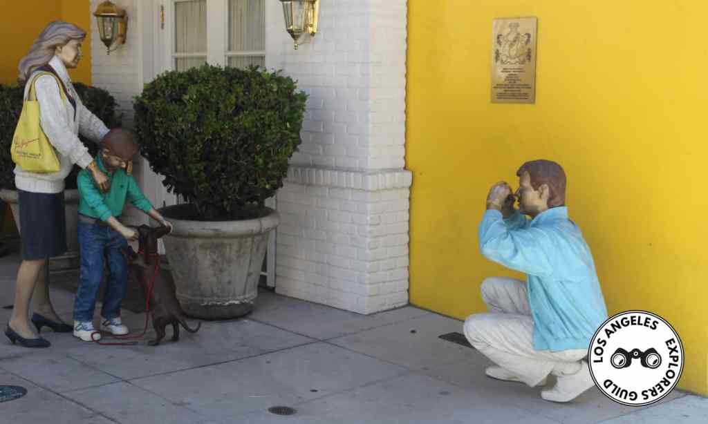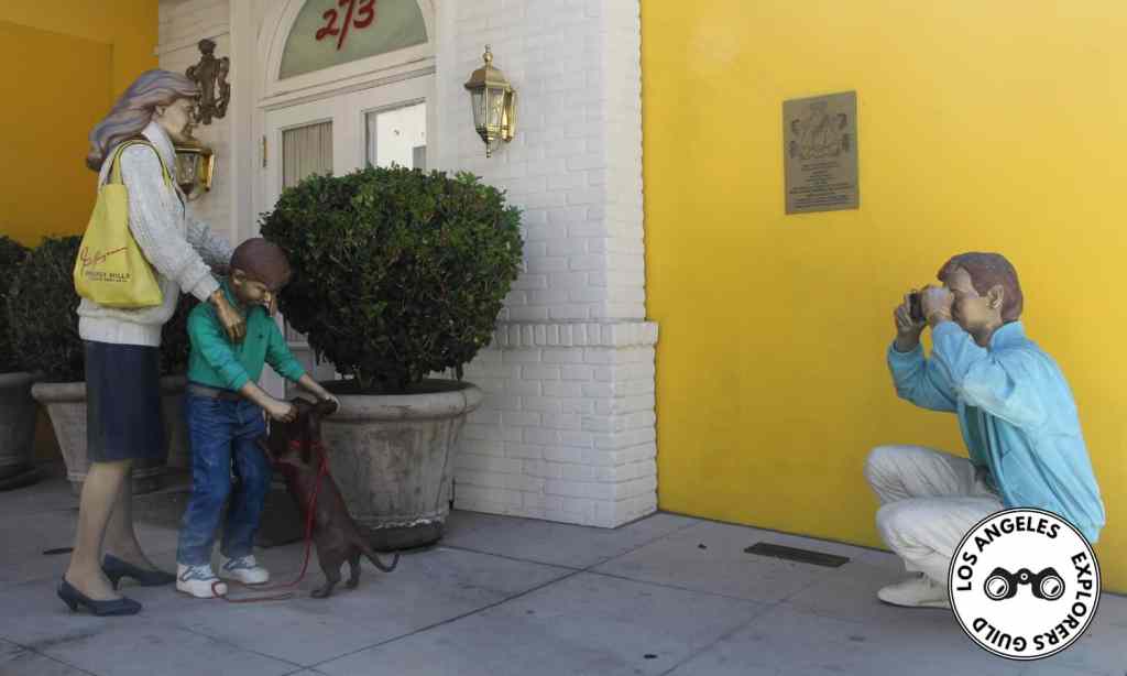 Right where Clifton Way dead ends into Cañon Drive, you’ll come across four painted bronze statues (one of which is a dog) arranged in a shopping scene in front of a replica yellow-and-white storefront. Together, the quartet is known as The Photo Shoot.